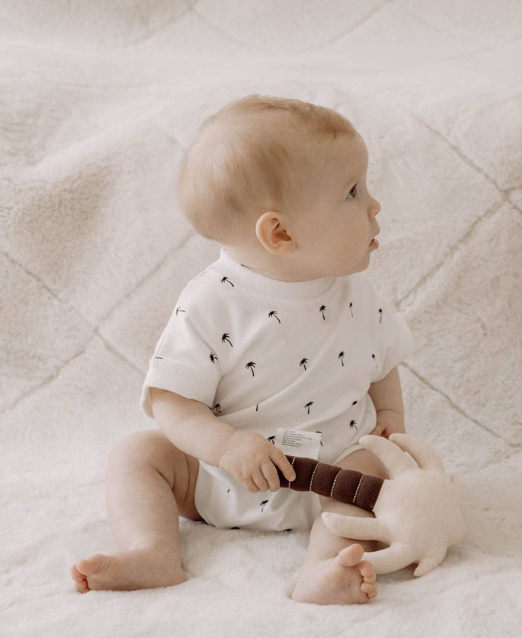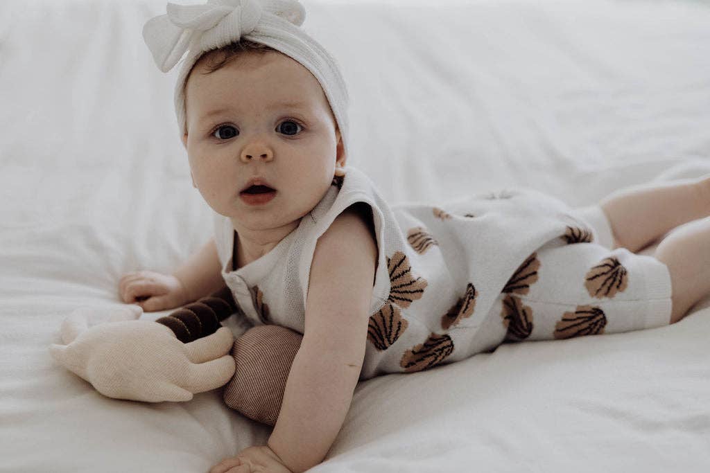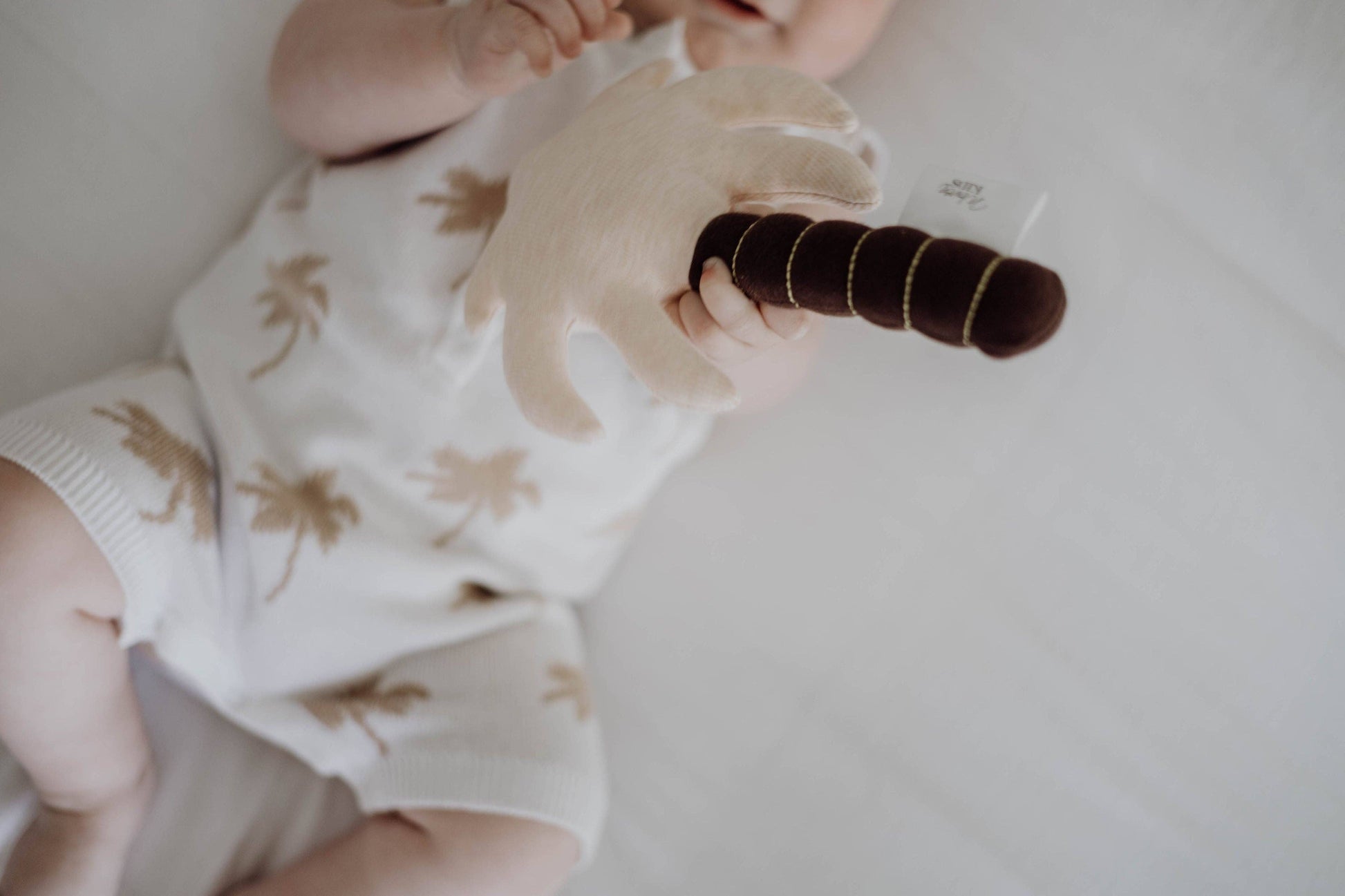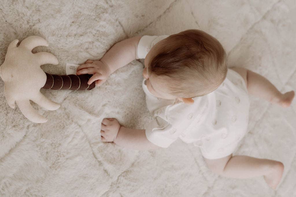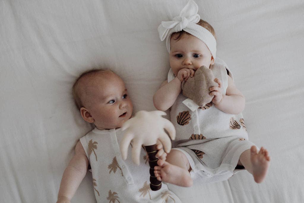 Available in 4 designs (seashell, palm tree, star fish + seahorse) these beautiful rattles are exclusively designed by us, featuring metallic gold stitching and are made with little hands in mind.